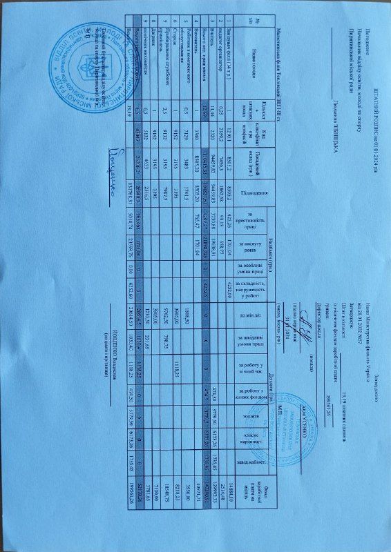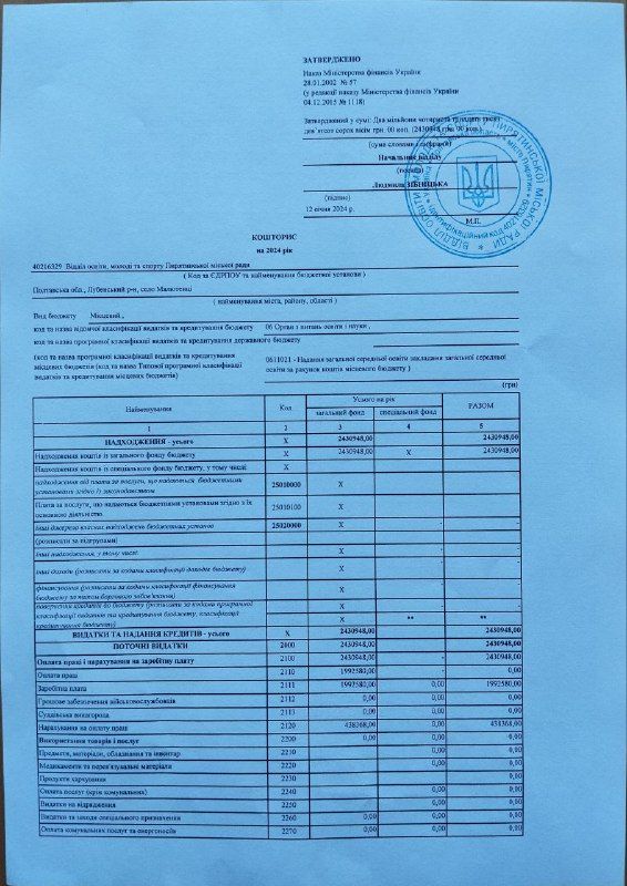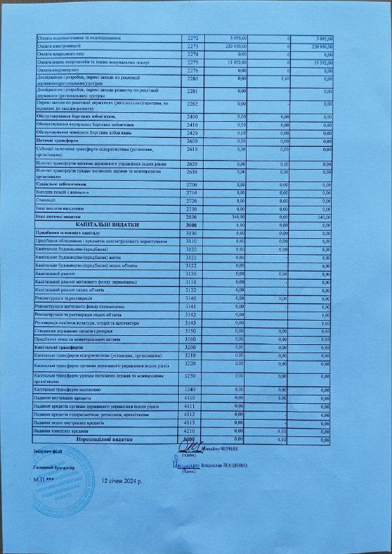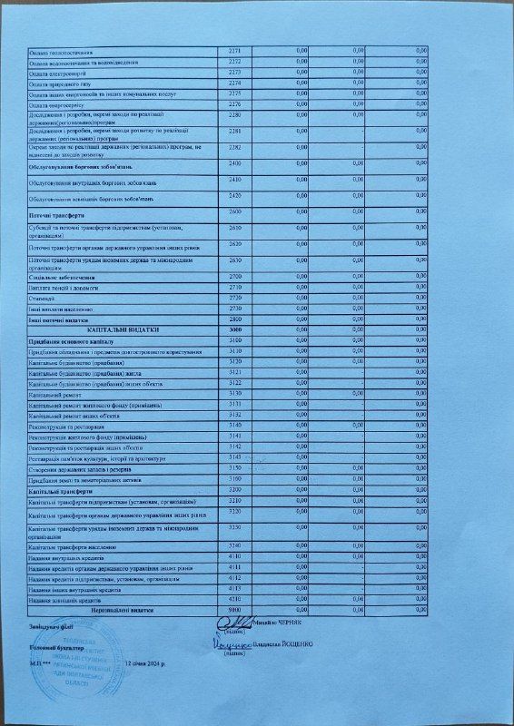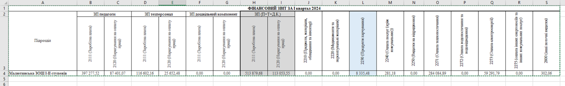| Підрозділ | ЗП педагоги | ЗП техперсонал | ЗП дошкільний компонент | ЗП (П+Т+Д.К.) | 2210 (Предмети, матеріали, обладнання та інвентар) | 2220 (Медикаменти та перевязувальні матеріали) | 2230 (Продукти харчування) | 2240 (Оплата послуг (крім комунальних)) | 2250 (Видатки на відрядження) | 2271 (Оплата теплопостачання) | 2272 (Оплата водопостачання та водовідведення) | 2273 (Оплата електроенергії) | 2275 (оплата інших енергоносіїв та інших комунальних послуг) | 2800 (інші поточні видатки) | ||||