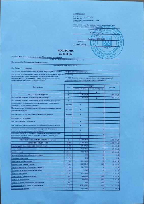 | Підрозділ | ЗП педагоги (П) | Доплата педагогам (ДП) | ЗП техперсонал (Т) | ЗП дошкільний компонент (Д.К.) | ЗП (П+ДП+Т+Д.К.) | 2210 (Предмети, матеріали, обладнання та інвентар) | 2220 (Медикаменти та перевязувальні матеріали) | 2230 (Продукти харчування) | 2240 (Оплата послуг (крім комунальних)) | 2250 (Видатки на відрядження) | 2271 (Оплата теплопостачання) | 2272 (Оплата водопостачання та водовідведення) | 2273 (Оплата електроенергії) | 2275 (оплата інших енергоносіїв та інших комунальних послуг) | 2282 (окремі заходи по реалізації державних (регіональних) програм, не віднесені до заходів розвитку | 2800 (інші поточні видатки) | |||||